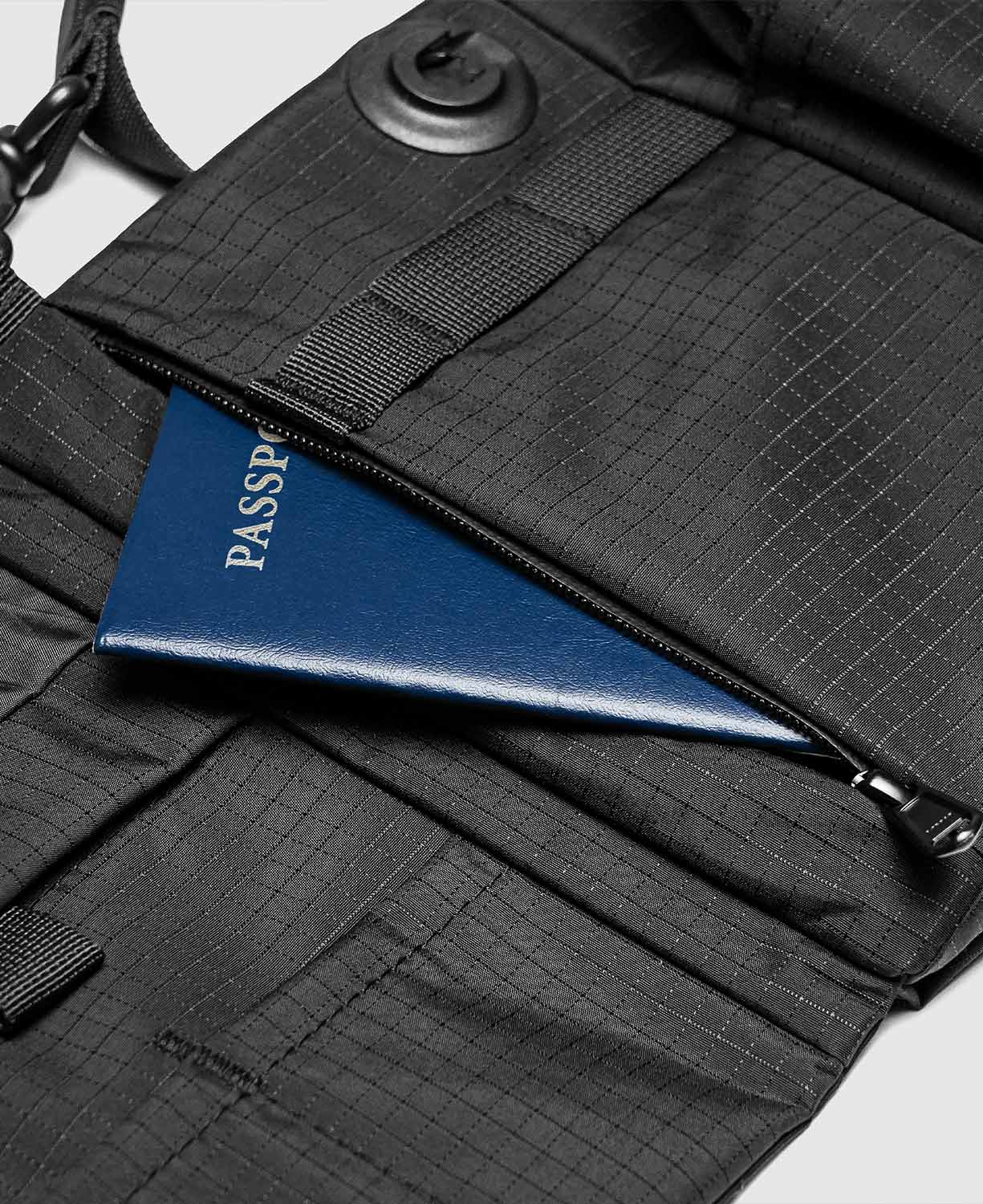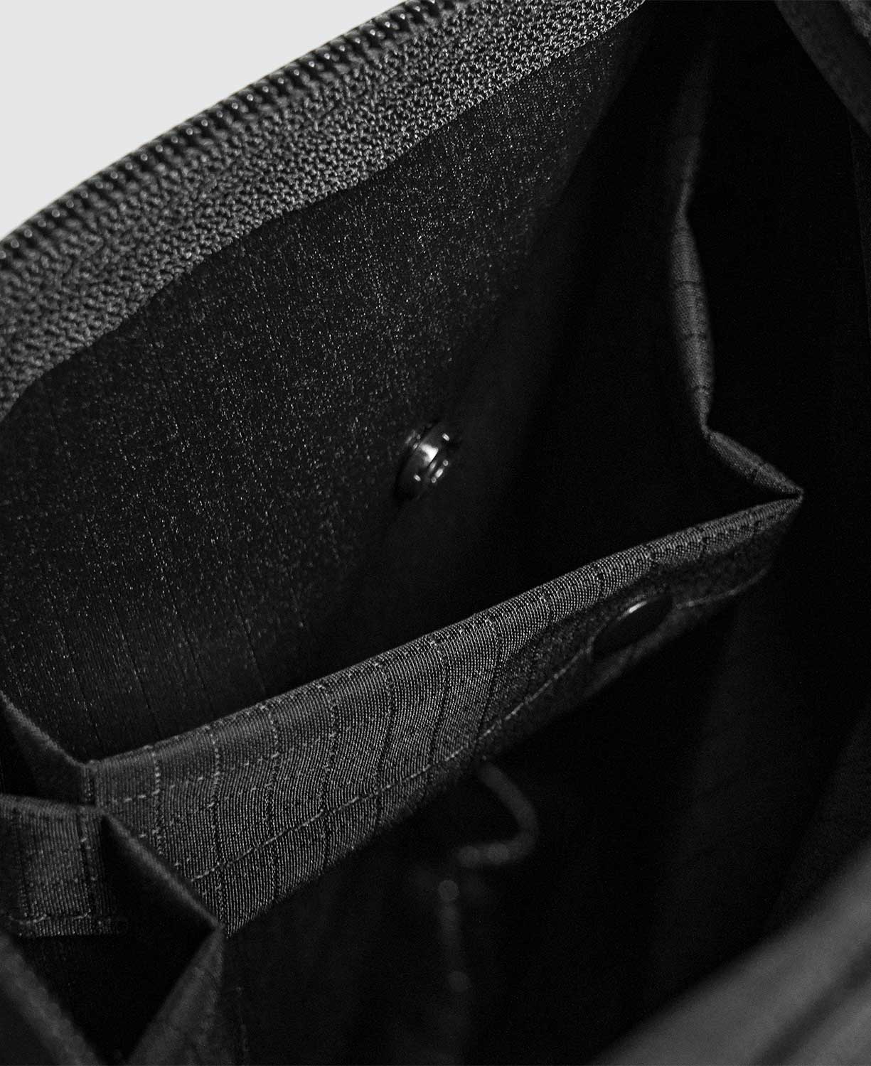 The right-side drawstring pocket with drainage accommodates bottles or umbrellas. The left-opening flap is secured with a FIDLOCK magnetic buckle for quick and secure access.