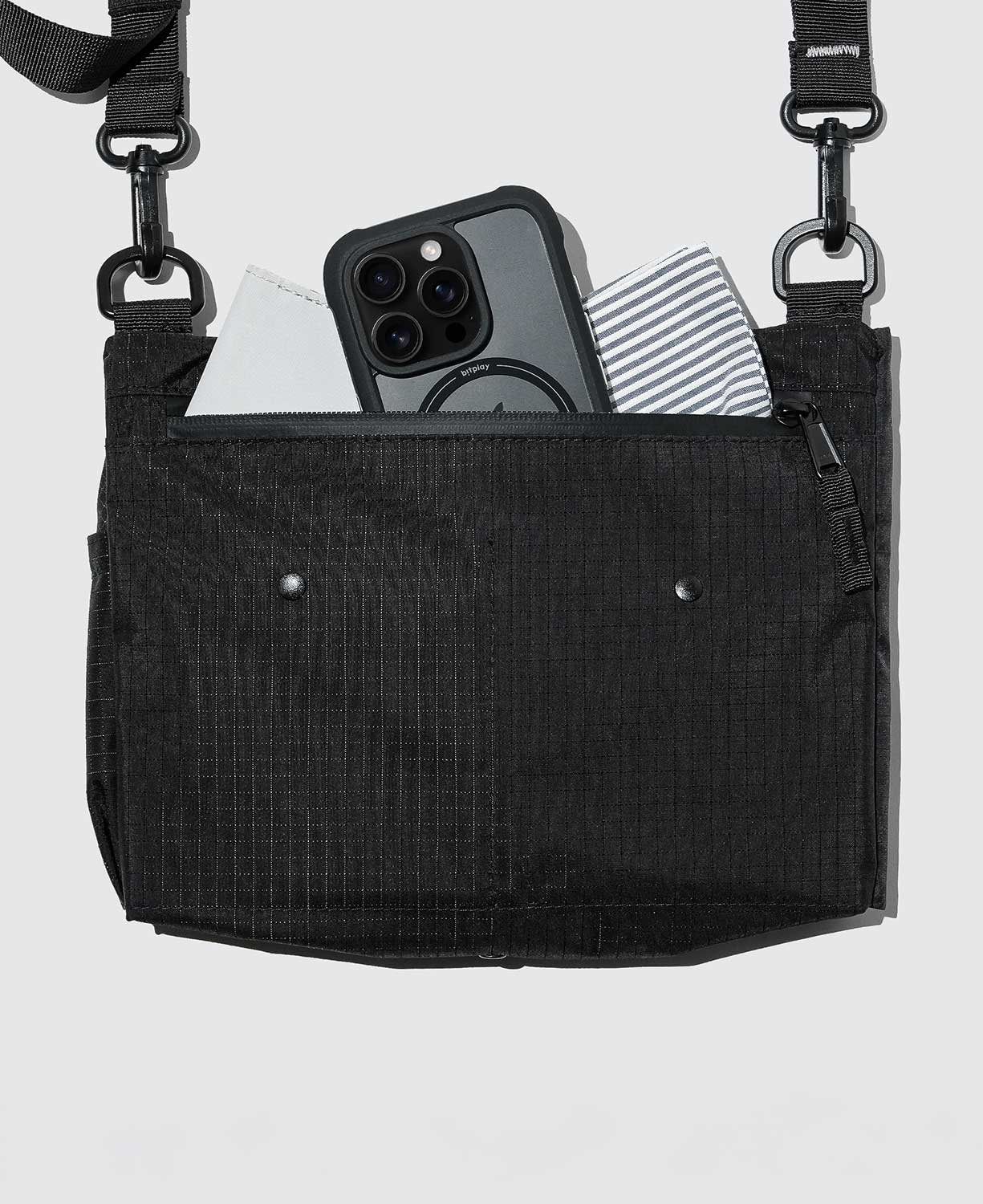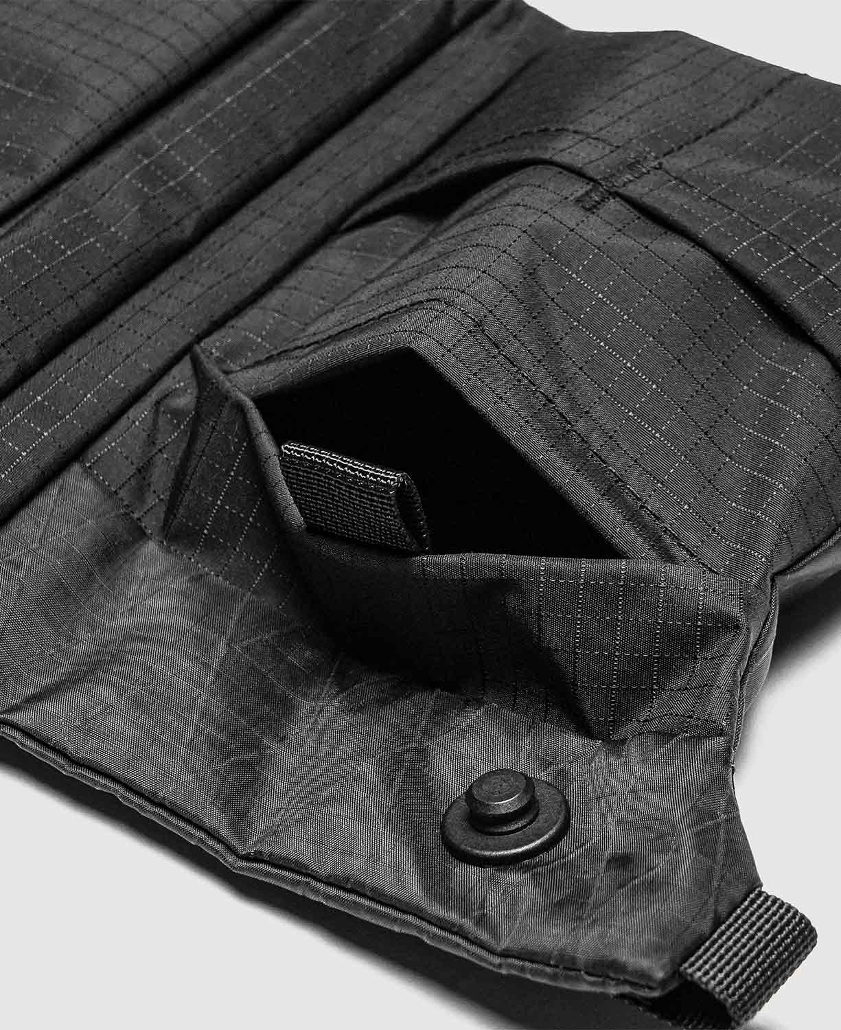 The interior includes a vertical zip pocket, webbing loops for small items, two open slots, a flip-top pocket, and dual snap-button pockets. A rear zip pocket provides extra storage for quick-access essentials.