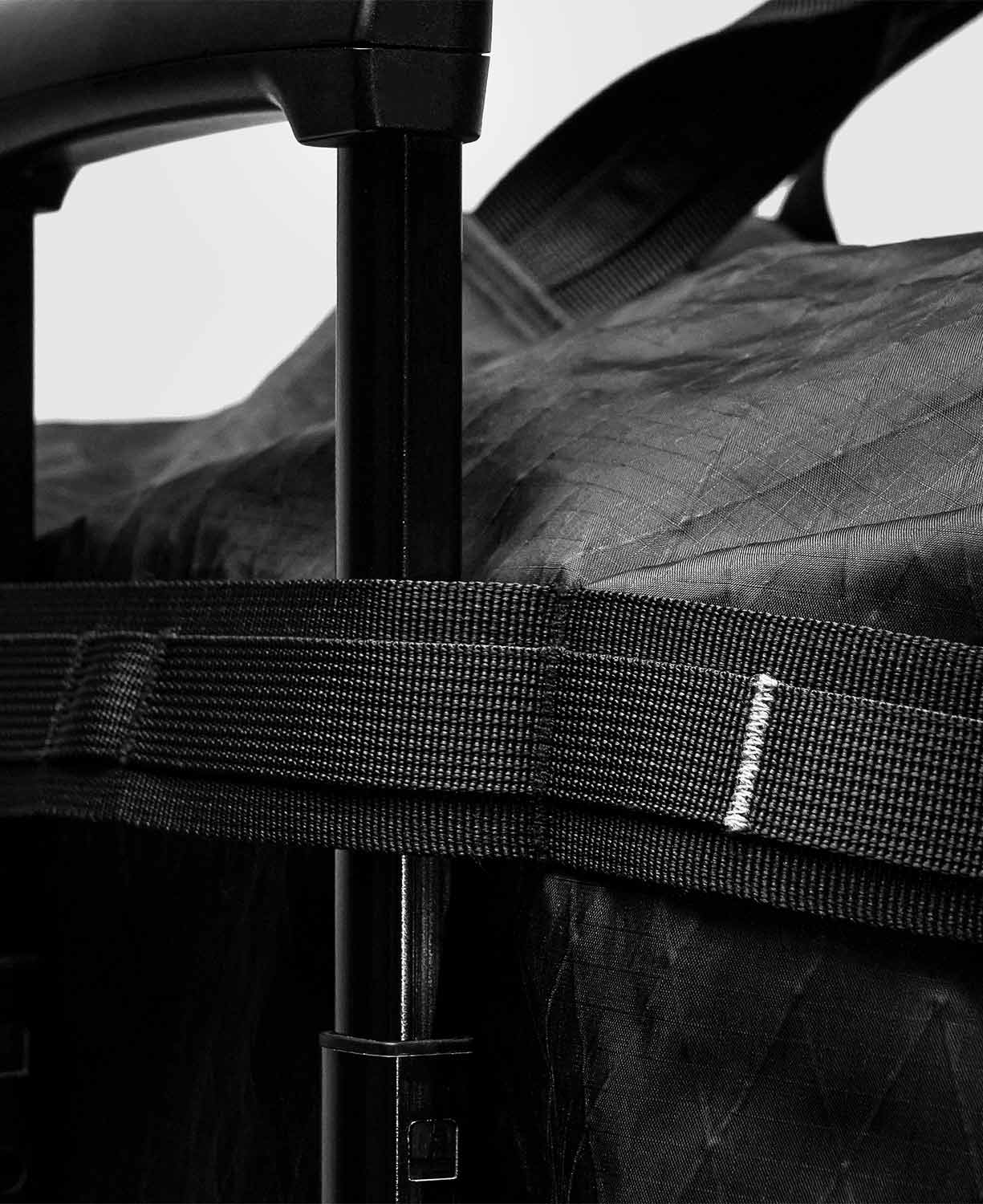 Center-aligned zippers allow smooth access. A wide front strap secures the bag to suitcase handles.